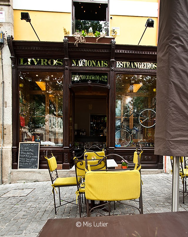 Fotos 19 y 20. Livraria Da Baixa (Carmelitas 15, 4050-162). La desaparecida Librería Fernando Machado es hoy una librería – bar que no ha perdido su apariencia . Aquí es posible tomarse un café, un vino o una copa mientras se lee un buen libro. Nuestra zona favorita, la terraza con sus sillas y mesas de hierro forjado. Y ese fantástico escaparate que exhibe objetos vintage recuperados y a la venta.