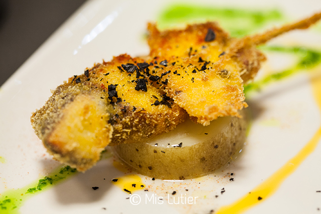 Photos 3 à 6. O Dezasete Taberna (Olmos, 17). Petite bouchée de carrilera. Pincho de poulpe panné. Marinés avec D.O. Valdeorras.