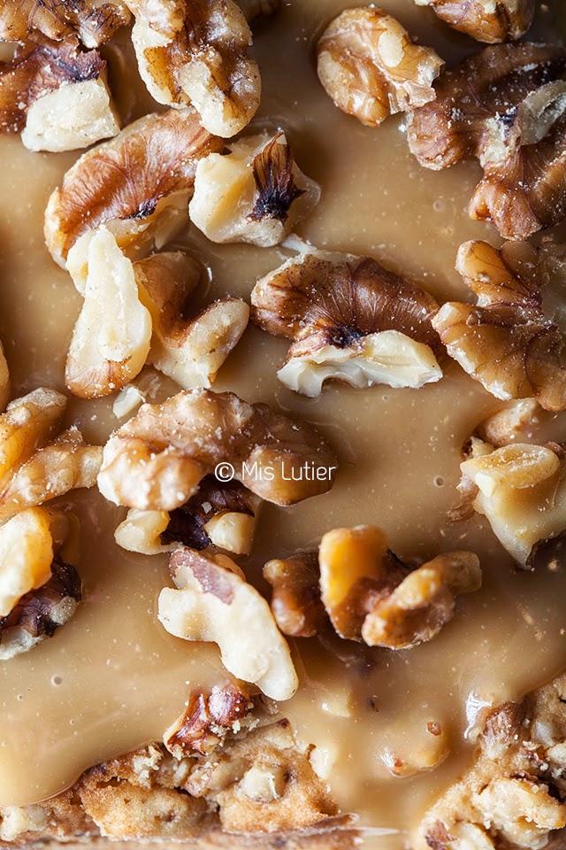 (7) Verter el toffe con cuidado sobre el bizcocho y decorar con las nueces troceadas.