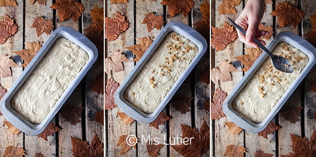 (5) Volcar la mezcla en el molde. Alisar la parte superior y espolvorear las nueces picadas. Hornear durante 1hora 30minutos. Retirar del horno y dejar enfriar por completo. Una vez frío desmoldar y reservar.