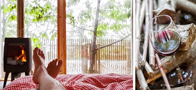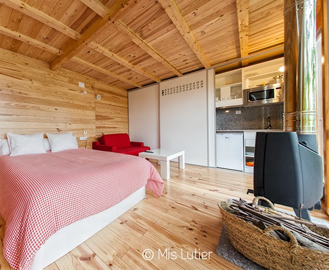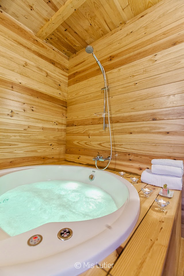 A estas cabañas no les falta de nada. Están equipadas con todas las comodidades que podáis imaginar: aire acondicionado/ calefacción, hilo musical, wifi gratuito, televisión, un buen secador de pelo (que Lutier bien sabe lo mucho que yo lo agradezco :D), una discreta cocina con todo el menaje básico necesario, una estupenda chimenea y un enorme jacuzzi, exterior o interior según la cabaña elegida, y al que no le faltan las velas y las sales de baño. Bajo pedido también se puede disfrutar de platos precocinados, conservas, vino y servicio de desayuno entregado en una bonita cesta de campo. Incluso cuentan con tirolina y puente tibetano para los más aventureros! Difícil resistirse.