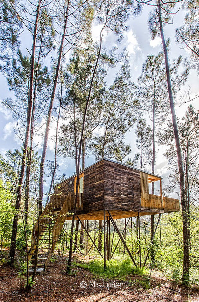 C’est le printemps et le jour se lève sous la pluie. Mais peu importe. Aujourd’hui nous dormons en hauteur, au milieu des branches, dans les arbres! Nous sommes dans la Casa da Creba, une des 8 cabanes qui font partie des Cabanas do Barranco. Une initiative hôtelière incroyable en pleine nature.