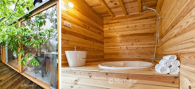 A estas cabañas no les falta de nada. Están equipadas con todas las comodidades que podáis imaginar: aire acondicionado/ calefacción, hilo musical, wifi gratuito, televisión, un buen secador de pelo (que Lutier bien sabe lo mucho que yo lo agradezco :D), una discreta cocina con todo el menaje básico necesario, una estupenda chimenea y un enorme jacuzzi, exterior o interior según la cabaña elegida, y al que no le faltan las velas y las sales de baño. Bajo pedido también se puede disfrutar de platos precocinados, conservas, vino y servicio de desayuno entregado en una bonita cesta de campo. Incluso cuentan con tirolina y puente tibetano para los más aventureros! Difícil resistirse.