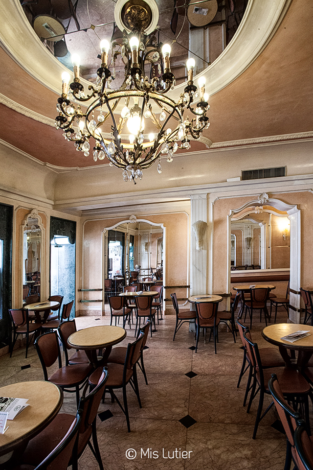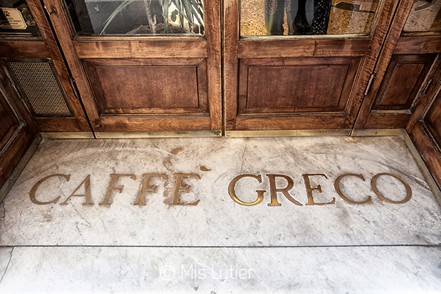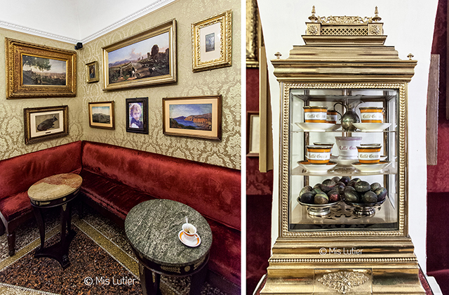 Fotos 6 a 10. Antico Caffè Greco (Via dei Condotti 86 – Roma). Fundado en 1760 es el más antiguo de Roma y el segundo más antiguo de Italia. Frecuentado por artistas e intelectuales en el s. XIX, hoy es además toda una galería de arte abierta al público.