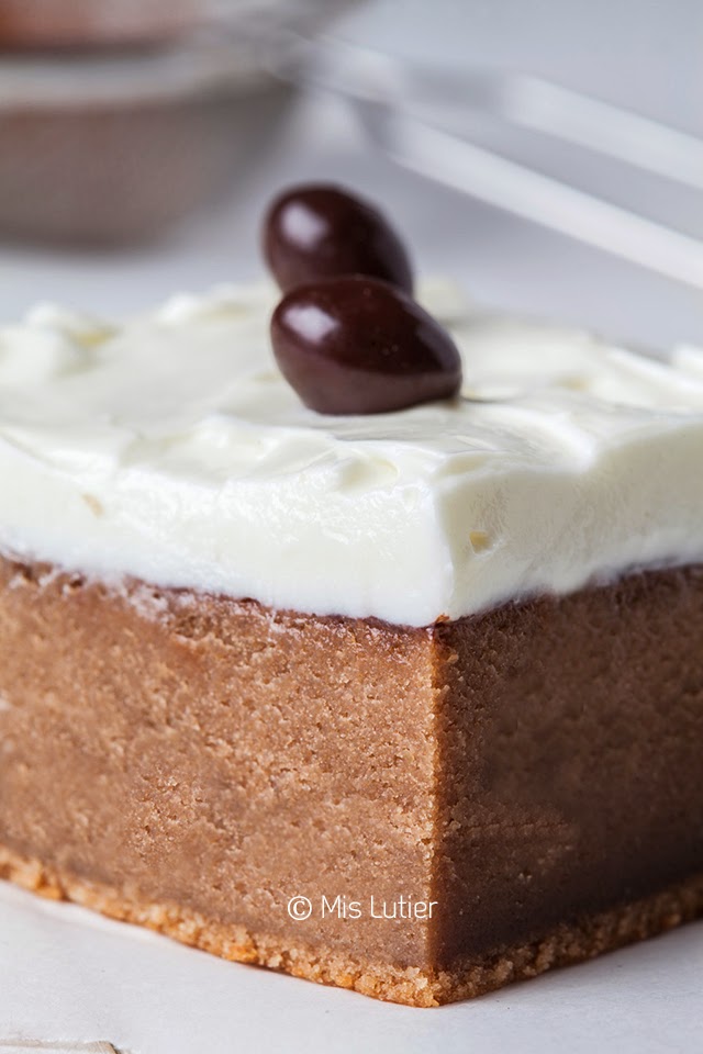 (7) Sobre el bizcocho ya frío espolvorear un poco de cacao, sobre él extender una buena capa de la mezcla con el queso crema, y finalmente decorar con los conguitos o chocolates.