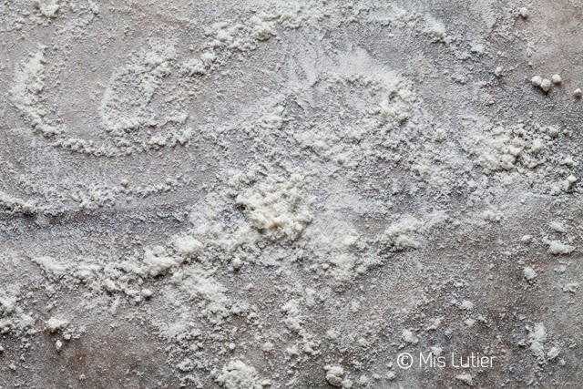 (4) C’est sur une base sur laquelle on a repartit un peu de farine que nous allons travailler la pâte feuilletée. Nous l’étirons puis y découpons des cercles à l’aide du moule de découpe circulaire. Il existe aussi des moules de découpe qui ont des bords ondulés, typiques des chaussons aux pommes. Comme nous n’avions pas ce type de moule de découpe, nous avons utilisé un bol pour définir un cercle et des ciseaux ondulés pour redécouper la circonférence de chaque cercle. Le résultat est parfait !