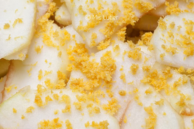 (1) Pelar y quitar el corazón a las manzanas. Cortarlas en láminas finas.