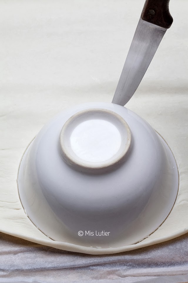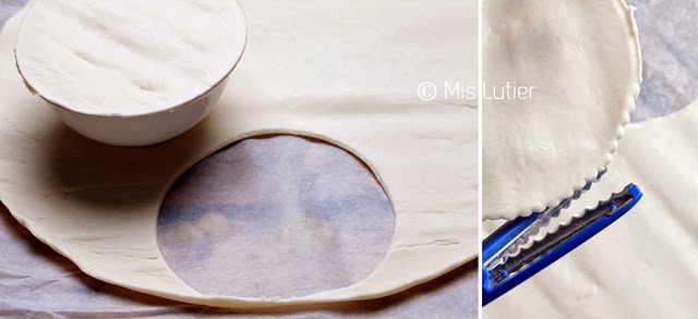 (4) Sobre una base espolvoreada de harina trabajamos la masa de hojaldre. Primero la estiramos y con el cortador vamos haciendo círculos. Existen cortadores que dibujan en los bordes esas típicas onditas de las chassons aux pommes. Como nosotros no teníamos un cortador de esas características, nos las ingeniamos del siguiente modo: usamos un bol como circunferencia y con unas tijeras de ondas especiales para manualidades repasamos los bordes. Quedó perfecto!