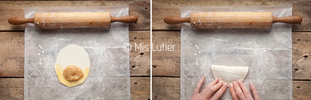 (6) Pincelamos con huevo batido los bordes únicamente de la mitad inferior del óvalo. Colocamos una cucharada de puré de manzana en esa misma mitad inferior, sin tocar los bordes donde hemos puesto huevo. Cubrimos con la parte superior del óvalo (como si fuera una empanadilla) y presionamos los bordes con los dedos (el huevo hará que ambas partes se adhieran y no se abran durante la cocción).