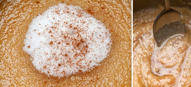 (3) Retiramos del fuego y lo trituramos bien. Incorporamos el azúcar y la canela. Removemos hasta que queden perfectamente integrados. Ya tenemos listo un delicioso puré de manzana. Lo dejamos enfriar por completo, y reservamos.