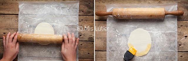 (5) Quand tous les cercles sont prêts, préparer les chaussons un par un et de la manière suivante: poser un cercle de pâte sur la base farinée et obtenir une forme ovale en utilisant un rouleau à patisserie que l’on passe sur la pâte de haut en bas.