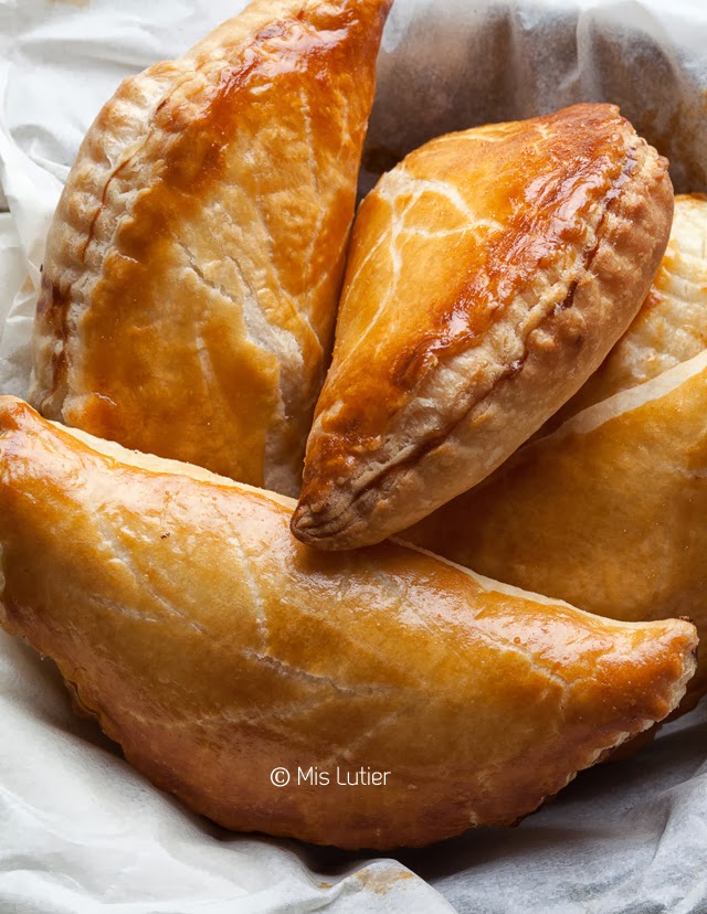 (8) Cubrimos una bandeja de horno con papel de hornear, y sobre él vamos colocando las chausson aux pommes. Las pincelamos con huevo batido y con la punta de un cuchillo, presionando suavemente, dibujamos sobre la superficie.