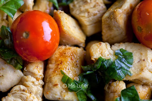 (2) En una sartén con un chorrito de aceite de oliva, freir el pollo junto con la albahaca picada y los tomates cherry enteros. Si el pollo se hace antes que los tomates, los sacamos y seguimos cocinando los cherry.