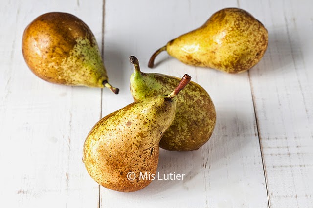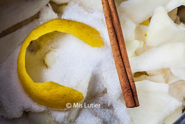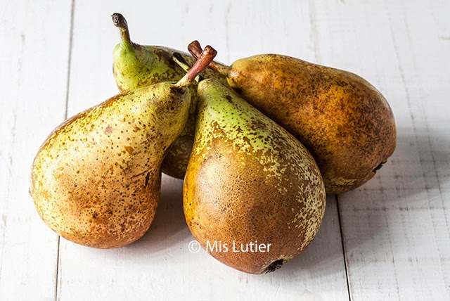 (1)Preparamos una compota de pera. Para ello pelamos y cortamos en láminas finas las peras. Las colocamos en un cazo con 50 g. de azúcar, 2 cucharadas soperas de agua, la corteza de medio limón y un palito de canela. Cocemos hasta que las peras estén totalmente blandas. Retiramos del fuego, tiramos la piel de limón y el palito de canela, y trituramos bien las peras. Ya tenemos lista la compota.