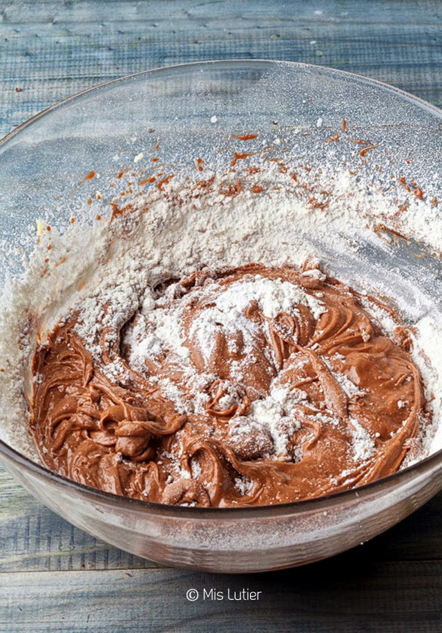 (5) Añadir ahora el chocolate que hemos reservado y mezclarlo bien todo. Echar la harina poco a poco, en forma de lluvia, junto con la levadura. Remover. Verter finalmente la leche.