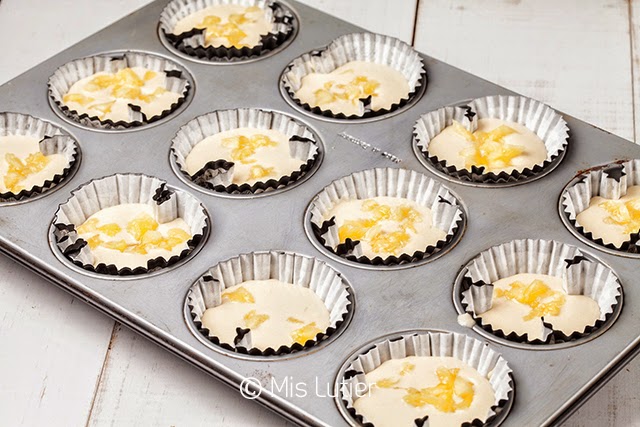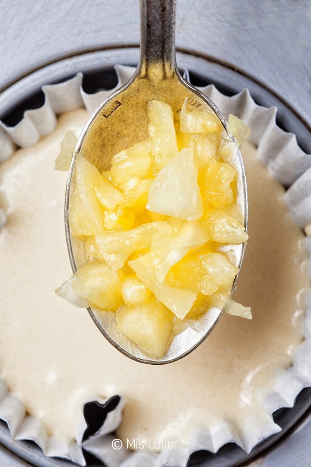 (8) Rellenar ahora cada cápsula de cupcakes, primero con un poquito de la mezcla en el fondo, después añadiendo algunos trozos de piña y finalmente cubriendo con más mezcla, pero sin llenar las cápsulas hasta el borde.