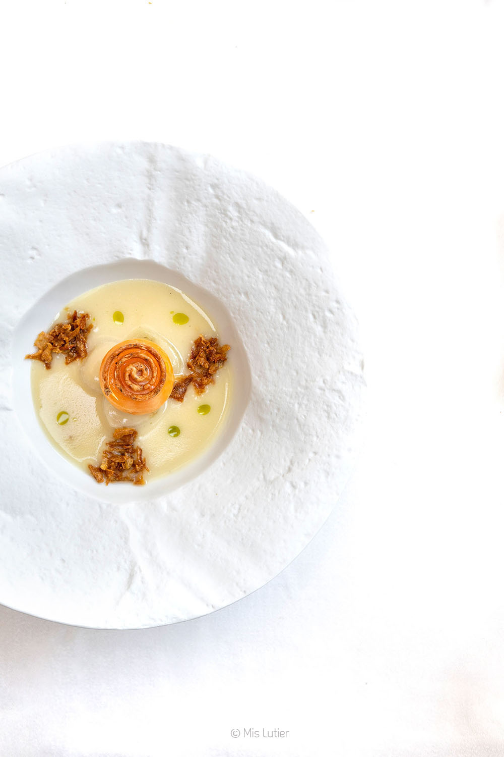 – Vichyssoise con puerro confitado, huevo de gallina y crujiente de especias