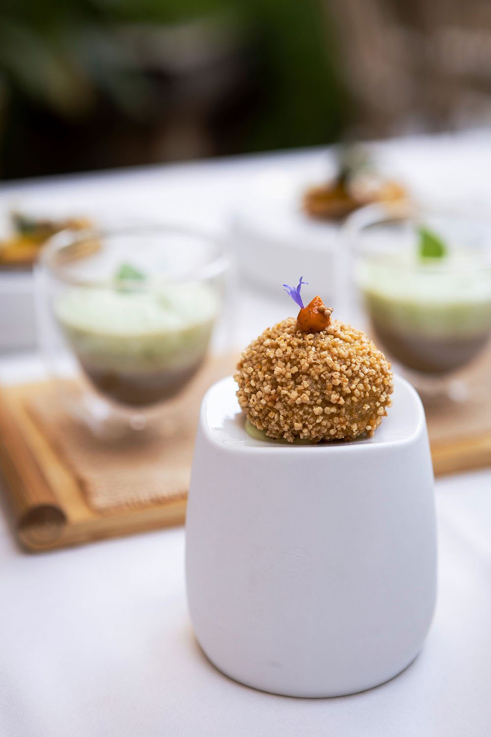 – Croqueta de berenjena ahumada con romescu y mostaza
