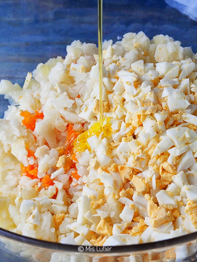 (3) Picar bien las patatas, las zanahorias y los huevos. Incorporar todo a un bol, añadir las cucharadas de aceite de oliva, un poco de sal y un chorrito de vinagre. Remover y mezclar bien.