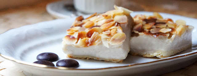 (5) Vertemos inmediatamente sobre el hojaldre y cubrimos con almendras laminadas. Horneamos a 180ºC durante unos 35 ó 45 minutos, hasta que tenga un ligero tono. Si queremos darle un tono más oscuro a las almendras podemos encender el gratinador durante un par de minutos. Servir frío, mejor después de unas horas en el frigorífico.