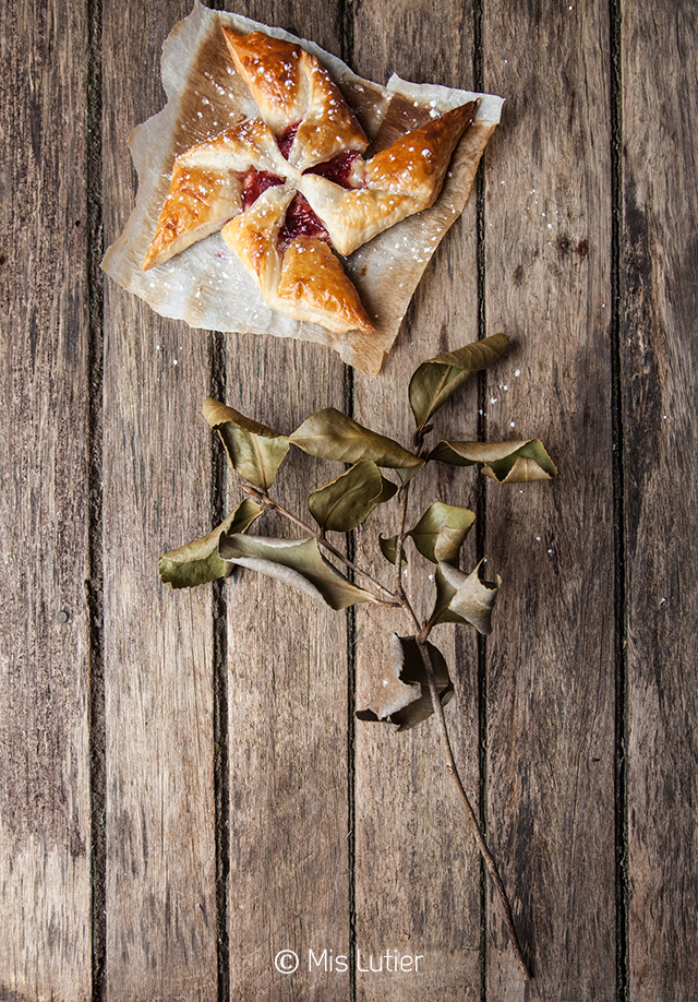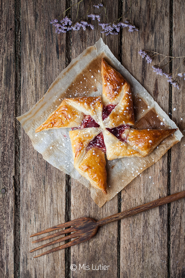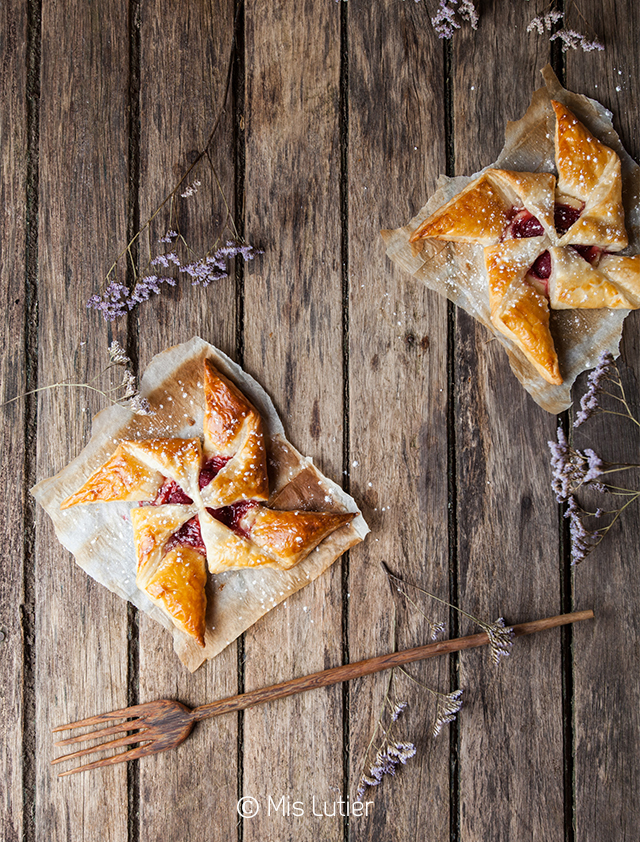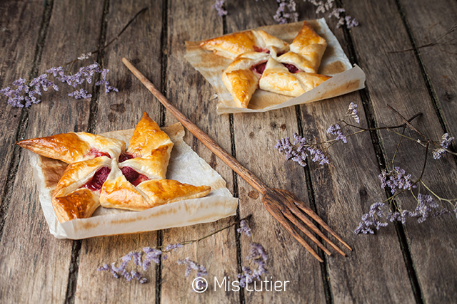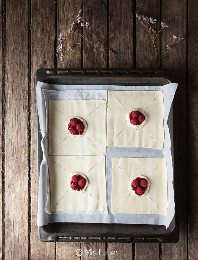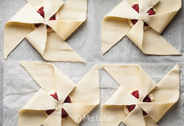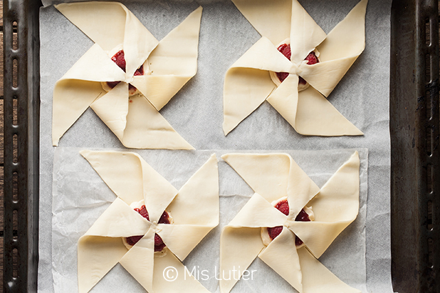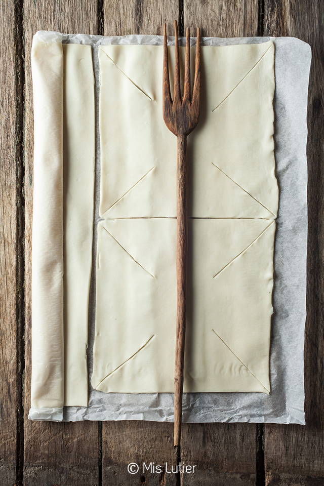 (3)Dividir la masa de hojaldre en cuadrados de unos 16cm. Colocar sobre el papel de horno evitando que se toquen. Con un cuchillo realizar cortes en cada cuadrado desde las puntas hasta el interior, pero no llegando totalmente a su centro.