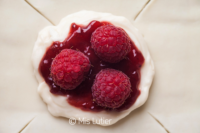 (4)Piquer le centre des carrés à l’aide d’une fourchette. Couvrir ce même centre centre avec un peu de mélange. Mettre un peu de confiture ensuite sur le dessus et placer en fin 3 ou 4 framboises.
