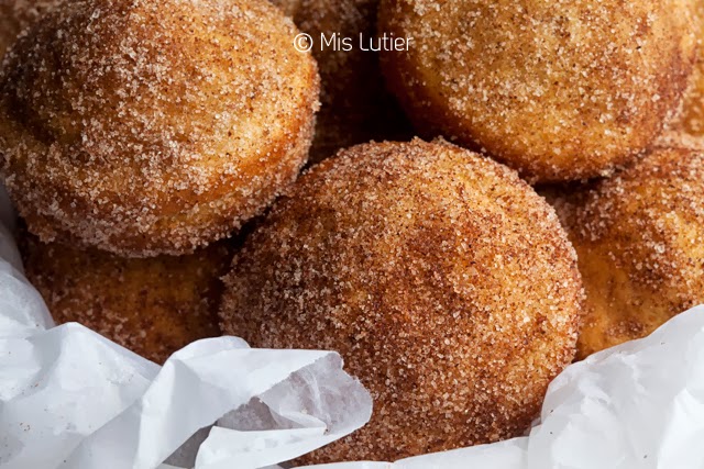 (8) Desmoldamos cuando aún estén tibios y, con la ayuda de un pincel, los vamos pincelando con la mantequilla derretida y pasándolos por la mezcla de azúcar y canela hasta que queden bien cubiertos.