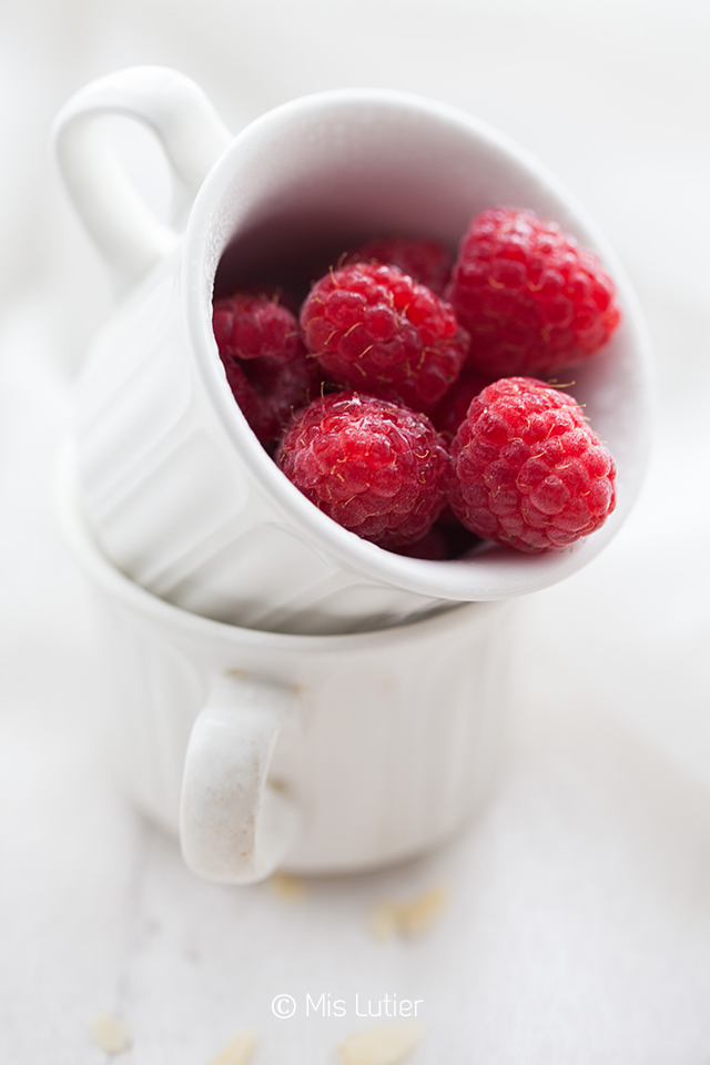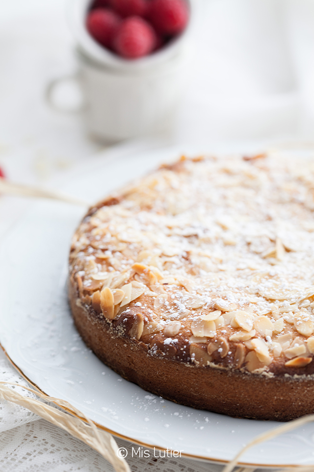 (4) Extender la mitad de la mezcla sobre el molde, alisando la parte superior. Repartir las frambuesas sobre la masa. Cubrir con la mezcla restante y repartir las láminas de almendras por la superficie.