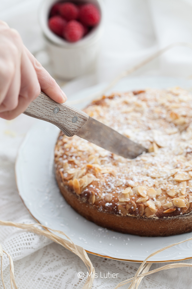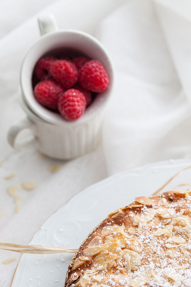 (4) Extender la mitad de la mezcla sobre el molde, alisando la parte superior. Repartir las frambuesas sobre la masa. Cubrir con la mezcla restante y repartir las láminas de almendras por la superficie.