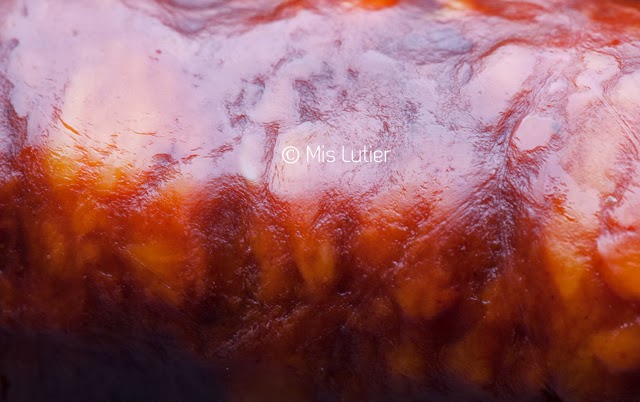 (9) Con la ayuda de una cucharilla, y un poco de paciencia, cubrimos las patatas con la preparación anterior, y vamos rellenando también los cortes.