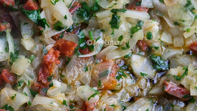 (7) Pendant ce temps, hacher une dent d’ail, ainsi que les oignons, le persil et le chorizo épicé. Faire revenir les oignons dans une poêle dans laquelle on aura préalablement versé une cuillère à soupe d’huile d’olive, puis ajouter l’ail, le persil et le chorizo. Salé, et faire revenir quelques minutes avant de réserver.