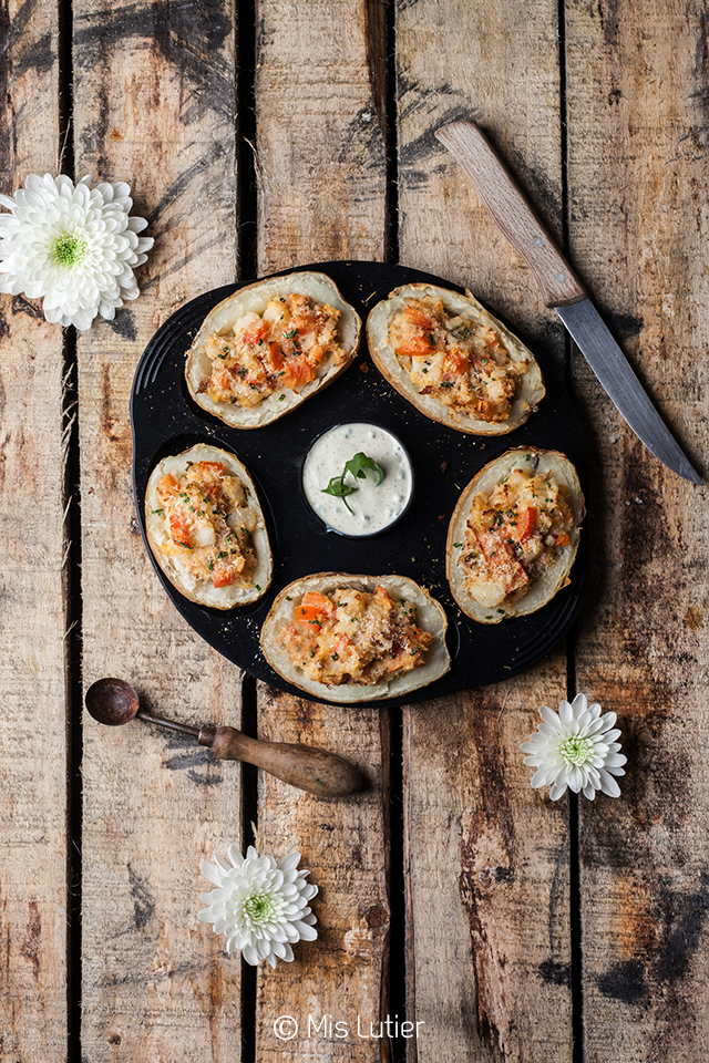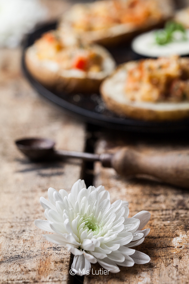 (5) Depositar el vaciado de las patatas en un bol, junto con el atún, el tomate cortado en dados pequeños, la mostaza, la nata y el queso crema, unas ramas de cebollino picado, sal y pimienta al gusto. Mezclar bien y aplastar todo con un tenedor.