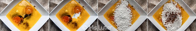 (2) Incorporar el azúcar, la harina, los huevos, la canela y la leche. Mezclar bien.
