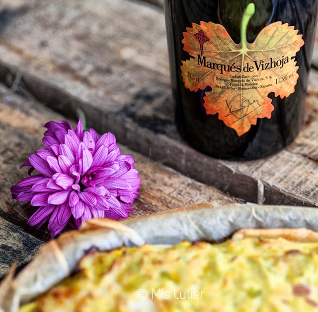 (5) Repartir la mezcla sobre la masa brisa y hornear unos 30 minutos, hasta que se dore. Servir acompañada de una buena copa de vino. Nosotros hoy con un fantástico afrutado vino blanco, cortesía de Marqués de Vizhoja.