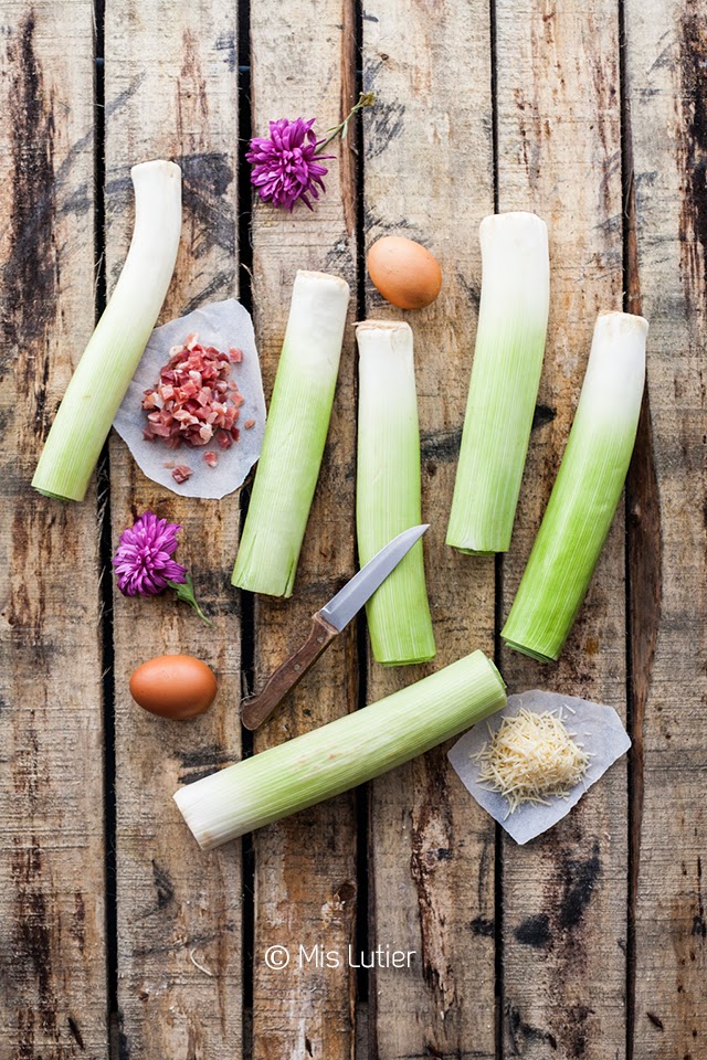 (3) Nettoyer et couper en petits morceaux les poireaux. Faire fondre dans une poêle le beurre et y incorporer les poireaux en petits morceaux, le sel et le poivre. Cuisiner à feu moyen pendant 20 minutes. Réserver.