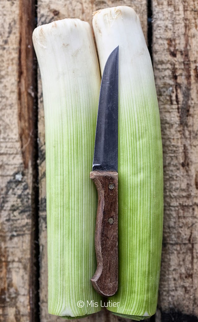 (3) Limpiar y picar bien los puerros. En una sartén fundir la mantequilla e incorporar los puerros picados, la sal y la pimienta. Cocinar a fuego medio unos 20 minutos. Reservar.