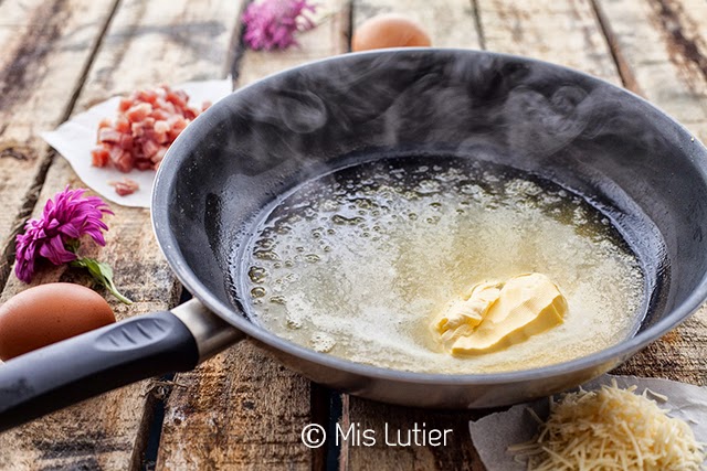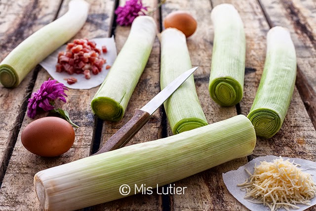 (3) Nettoyer et couper en petits morceaux les poireaux. Faire fondre dans une poêle le beurre et y incorporer les poireaux en petits morceaux, le sel et le poivre. Cuisiner à feu moyen pendant 20 minutes. Réserver.