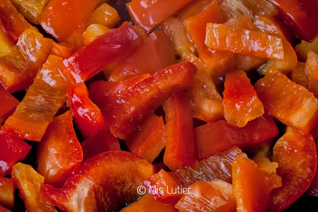 (8) En una sartén con una cucharada de aceite de oliva se sofríe un cuarto de pimiento rojo picado previamente. También reservamos.