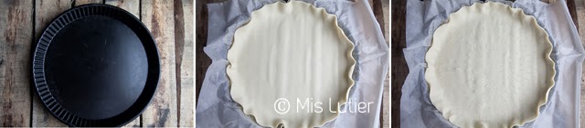 (5) Cubrimos un molde circular con papel de horno y sobre él extendemos la masa brisa, adaptándolo a la forma del molde con la ayuda de los dedos.