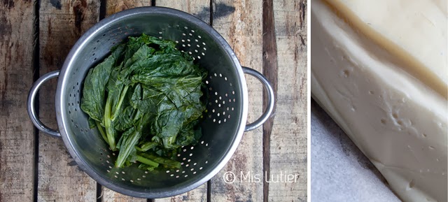 (7) Limpiar los grelos eliminando los tallos gruesos. Lavarlos y cocerlos en agua con sal unos 10min. Retirar y escurrir con la ayuda de un colador. Reservar .