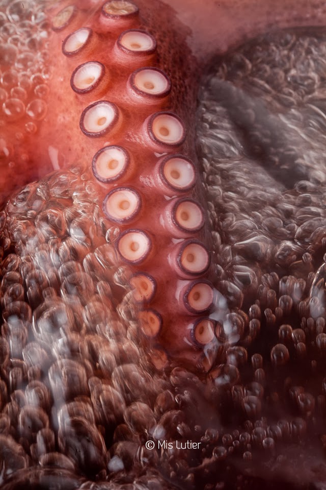 (2) Faire chuaffer de l’eau dans une grande casserole. C’est quand l’eau bout que nous devons «effrayer» le poulpe. Il s’agit de l’introduire et le sortir de l’eau 3 fois en le tenant par la tête., ce qui permettra que la peau et la chair du poulpe se maintiennent fermes et ne se déchirent pas (vous verrez comment les tentacules s’enroulent et se contractent, expliquant ainsi l’expression «effrayer» :)). Le laisser cuire finalement pendant 35 minutes approx. Il faudra le piquer à l’aide d’une fourchette de temps en temps pour vérfier sa dureté. Il est important qu’il soit à un point de dureté intermédiaire, ni trop mou, ni trop dur.