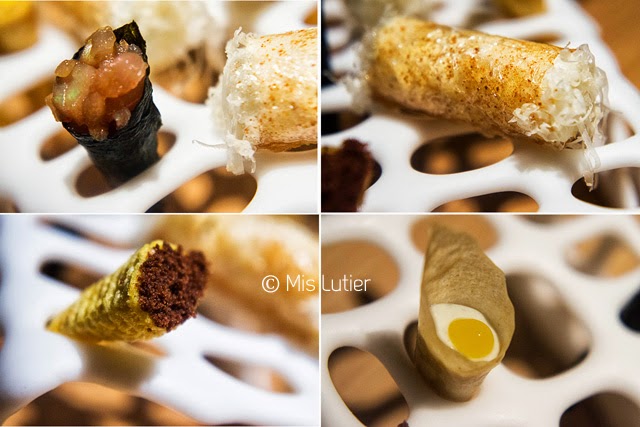 Fotos 11 a 14. Snacks: cucuruchos con tartar de cabra, caramelo de cebolla con bacon y avellana, 3ds con foie y polvo de chocolate.