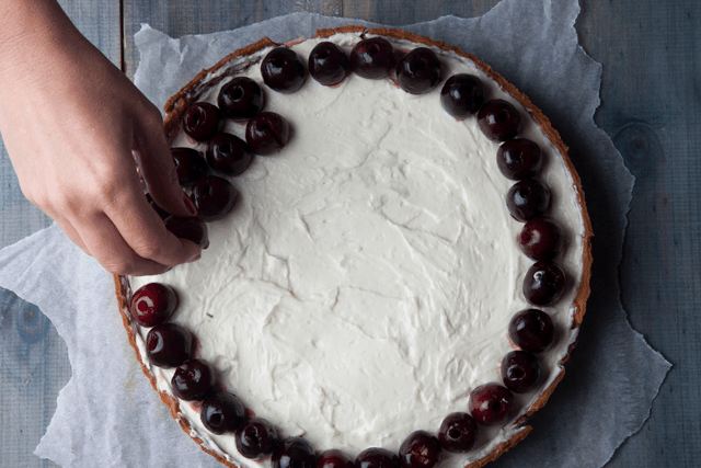 (6)Decoramos toda la superficie de la tarta con cerezas. Si queréis deshuesarlas como hemos hecho nosotros, tenéis un tutorial muy curioso en la web de Directoal Paladar. Eso sí, armaros de paciencia! Pero el resultado vale la pena.