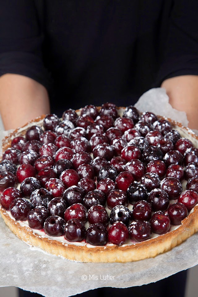 (6) Décorer toute la surface de la tarte avec les cerises. Si vous désirez le dénoyauter comme nous l’avons fait, vous disposez d’un tutorial dans la web de Directo alPaladar. Il faudra de toute façon être patient! Mais le résultat en vaut la chandelle.