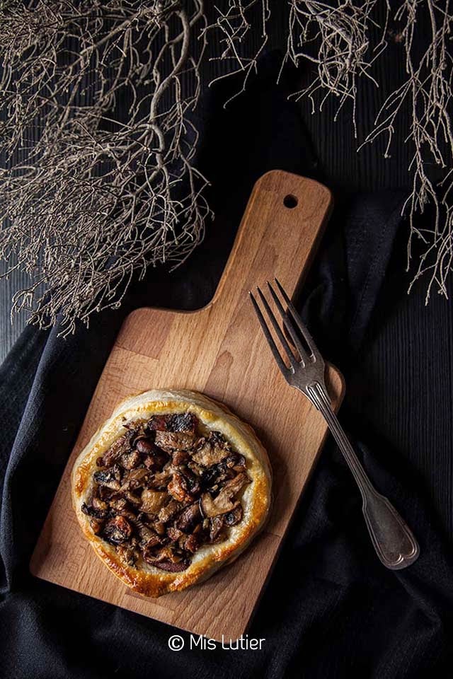 (4) Retirar la masa del frigorífico. Marcar ligeramente un círculo concéntrico de menor tamaño en cada una de las masas, dejando más o menos un centímetro de distancia con respecto al borde. Rellenar el círculo marcado con una cucharada de la mezcla de setas.