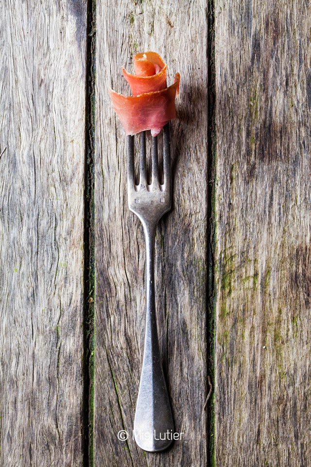 (6) Couper les champignons en tranches fines. Ainsi que 2 feuilles de basilic. Couper les tranches de jambon fumé en franges fines aussi.
