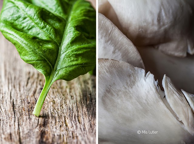 (6) Mientras, cortar las setas y el jamón en tiras finas. Picar 1 diente de ajo. Y dos hojas de albahaca.