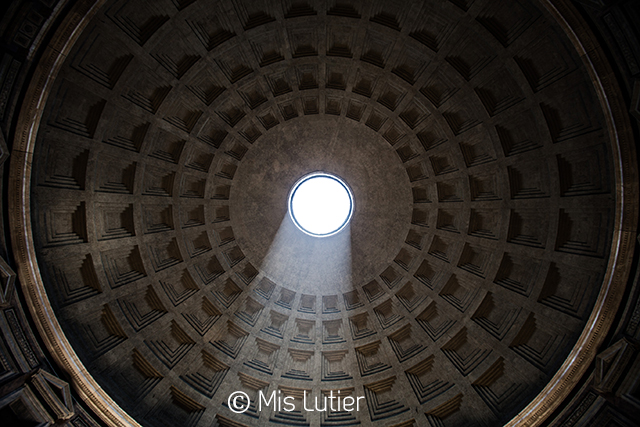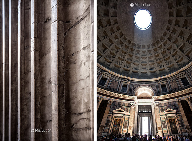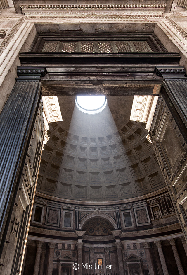 Fotos 1 a 8. Panteón de Agripa (Piazza della Rotonda – 00186 Roma). Ha servido de inspiración a muchos arquitectos. Geométricamente perfecta. La distancia entre el suelo y la cúpula es la misma que su diámetro. La imagen de su apertura circular en el centro de la cúpula, por la que pasa la luz e incluso la lluvia, es fascinante.