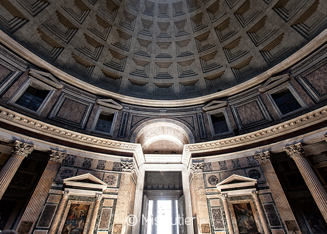 Photos 1 à 8. Panthéon de Agripa (Piazza della rotonda – 00186 Rome). Elle a inspiré à de nombreux architectes. Géométriquement parfaite. La distance entre le sol et la coupole est la même que son diamètre. L’image de son ouverture circulaire au centre de la coupole, par laquelle passe la lumière du jour ainsi que la pluie est absoluement fascinante.